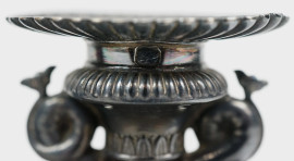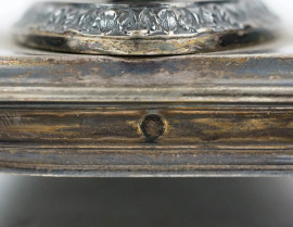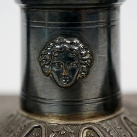 Calamaio in argento, Francia, XIX secolo, vaschette con decoro baccellato e teste femminili, sostenute da coppia di animali marini, punzone Parigi, 1819-1838, cm h 18x18x7, peso gr. 250, (mancanti le ampolle)