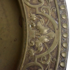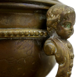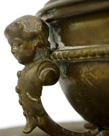 Calamaio in metallo dorato, a forma di coppa con decori a rilievo e tre piedi a foggia di putti desinenti a zampa ferina, piatto con decori analoghi e profilo a ovoli, fine XIX-inizi XX secolo, cm h 17x24 circa, (difetti)