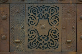 Cassaforte in ferro del XIX secolo, ad un'anta con raffinata serratura lavorata, abbellita da borchie e rinforzi in ferro, chiave presente, cm h 59x60x29, (difetti, parti arrugginite)