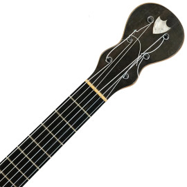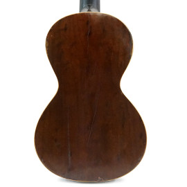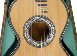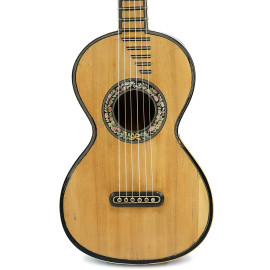 Importante liutaio di Mirecourt (timbro sul fondo) del 1825. La buca e il bordo della tavola sono ornati con intarsi di madreperla che continuano lungo il manico, fino alla paletta. Gli intarsi di madreperla terminano con un bordo di osso che incornicia tavola, fondo, manico e paletta. Fasce e fondo in acajou.
