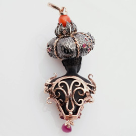 Ciondolo moretto in ebano, oro 9 kt e argento 925, impreziosito da rubini, zaffiri e diamanti, cm 10, peso gr. 180,3