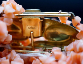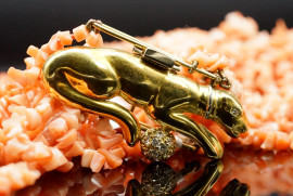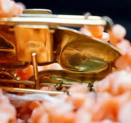 Collana in corallo a 10 fili con chiusura in oro 750 a foggia di pantera impreziosita da brillantini, peso gr. 272