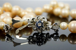 Collana in finte perle, chiusura in oro 18 kt impreziosita da zaffiri e brillantino, lungezza cm 56