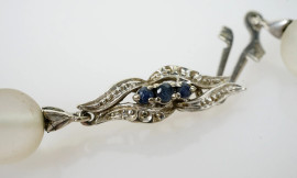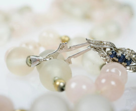 Collana in quarzo rosa e vetro satinato con chiusura in oro bianco 18 kt e zaffiri, lunghezza cm 85, (segni di utilizzo)