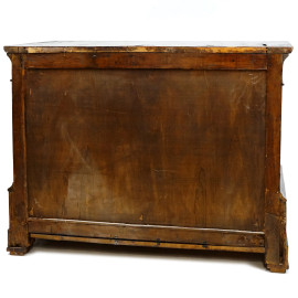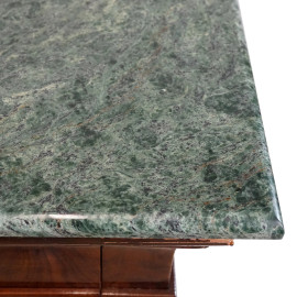 Comò in legno impiallacciato, XIX secolo, piano in marmo verde, fronte a quattro cassetti, cm h 99x132x66, (difetti)