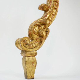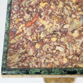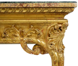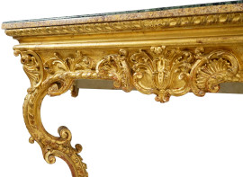 Consolle in legno scolpito e dorato con piano in marmo broccatello e profilo in marmo verde, XIX secolo, gambe mosse scolpite a roccailles e foglie, cm h 86x108x 33, (difetti)
