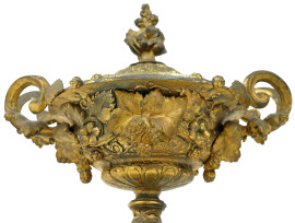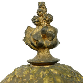 Coppa biansata in metallo dorato, decori rilievo a fruttibase in marmo, cm h 31, (difetti)