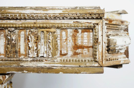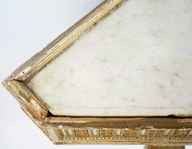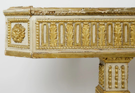 Piani in marmo, sottofascia decorata a riserve con profili perlinati, rosoni e foglie d'acanto alternate, montanti ad obelisco rovesciato scanalati.