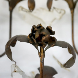Coppia di appliques a due luci in ferro battuto con pendenti in vetro, ornate a motivi fogliacei e rosette, XX secolo, cm h 40 circa, (difetti)