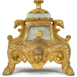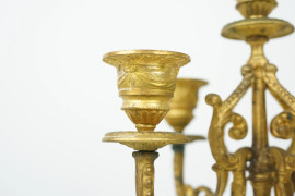 Coppia di candelabri a cinque fiamme in metallo dorato e alabastro, XX secolo, cm h 39,5x15, (difetti)
