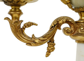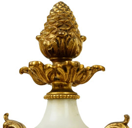 Coppia di candelbari a due fiamme in metallo dorato e marmo bianco, metà del XX secolo, cm h 34,5, (difetti)