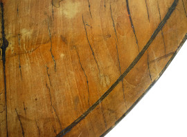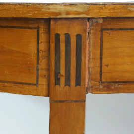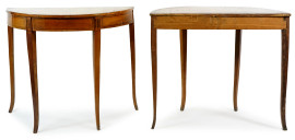 Coppia di consoles a mezzaluna in legno impiallacciato e filettato, inizi del XIX secolo, poggianti su quattro gambe a sciabola, cm h 81x92x49, (difetti)