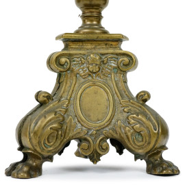 Coppia di lumi da tavolo in bronzo, poggianti su tre piedi leonini, cm h 57x15, (difetti)