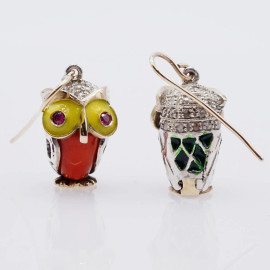 Coppia di orecchini a forma di gufo in oro 9 kt e argento impreziositi da diamanti, rubini e corallo, cm 2,5, peso gr. 39