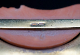 Coppia di orecchini a forma di mezzaluna in oro giallo 18 KT e corallo, cm 6, peso gr. 19,2, (mancanti farfalle)