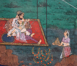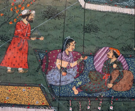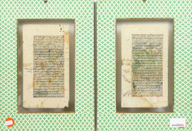 Coppia di pagine miniate e dipinte raffiguranti scene e personaggi di corte, cm 29x16,5, arte orientale, entro cornici, (macchie e difetti)