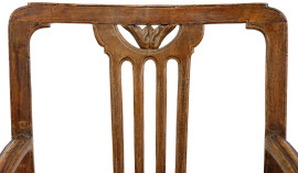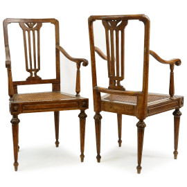 Coppia di poltroncine in legno di noce, XVIII secolo, schienale a giorno intagliato, seduta in paglia di Vienna, gambe scanalate e tornite, cm h 99, (difetti)