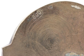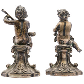 Coppia di putti musicanti in argento cesellato, manifattura italiana, seconda metà del XX secolo, cm h 9, peso gr 442