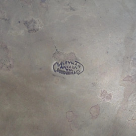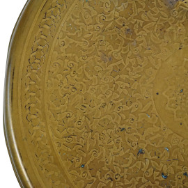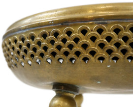 Coppia di sgabelli in ottone, Turchia, Ankara, XX secolo, decori incisi e traforati, tre gambe desinenti a zampa ferina, cm h 32x36, (difetti)