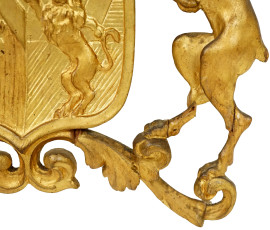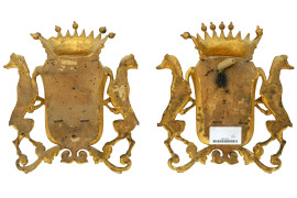 Coppia di stemmi araldici in legno scolpito e dorato, blasone quadripartito sormontato da corona e sorretto da levrieri ai lati, piedini di volute vegetali, fine XIX secolo, cm h 29x25, (difetti e mancanze)
