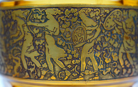 Coppia di vasi in cristallo sfaccettato color ambra, fascia con decoro di menadi dazanti, firma e marca incise sotto la base, Cecoslovacchia, Moser Karlsbad, XX secolo, cm h 16x10,5.