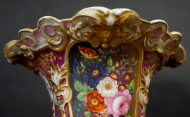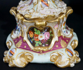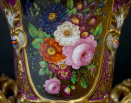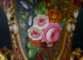 Coppia di vasi in porcellana policroma, Francia, XIX secolo, con decori floreali dipinti a mano, finiture e prese laterali dorate, cm h 35,5, (difetti, mancanze)