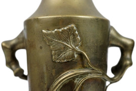 Coppia di vasi orientali in bronzo, fine XIX-inizi XX secolo, decori a rilievo raffiguranti grappoli e pampini d'uva, prese a forma di rami, cm h 33,5, (lievi difetti)