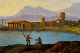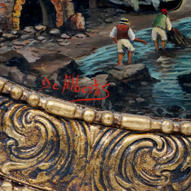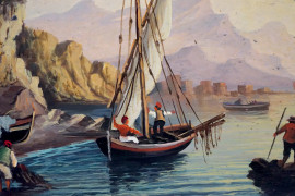 Coppia di vedute del Golfo di Napoli, olio su tavola ad assetto ovale, cm 50x69,7, firmati, entro cornice