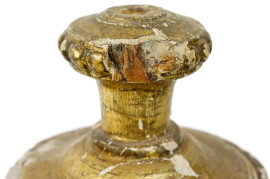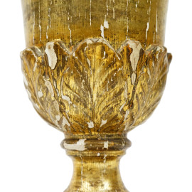 Coppia vasi di portapalma in legno scolpito e dorato, XIX secolo, corpo a balaustro decorato a motivi fogliacei, base circolare modanata, cm h 28, (difetti)