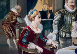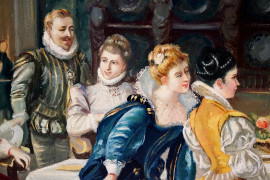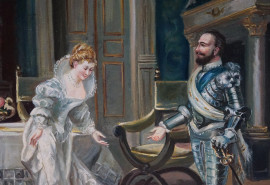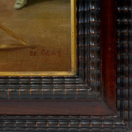 Cortigiani e cavalieri, olio su tela, cm 72x100, firmato De Pasas, entro cornice.