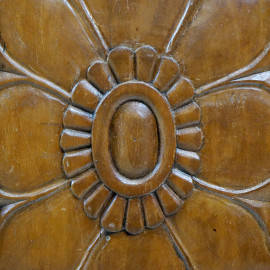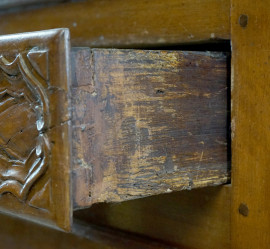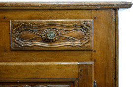 Credenza in noce, Piemonte, XVIII secolo, a tre cassetti pannellati e due sportelli con decori intagliati a motivi floreali, cm h 93x125x52, (difetti)