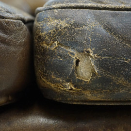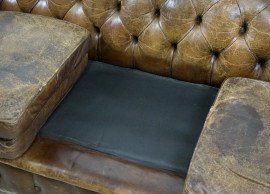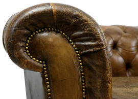 Divano Chester in pelle marrone, a tre posti, schienale capitonnè, XX secolo, cm h 70x218x94, (difetti)