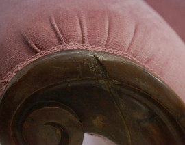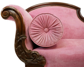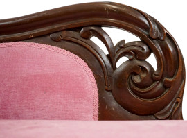 Dormeuse in mogano intagliato, Inghilterra, XIX secolo, imbottita e rivestita in stoffa rosa, completa di rotelle, cm h 82x62x190, (difetti)