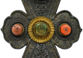 Fibbia cruciforme in bronzo e metallo dorato, cm 19,5x14, arte orientale, fine XIX secolo, supporto in plexiglass.