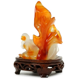 Figure, piccola scultura in corniola, cm 9x5, base in legno, arte orientale, XX secolo, (difetti)