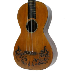 Giacomo Sora, Napoli, 1829 - Chitarra romantica suonabile, piano in abete, fasce e fondo in legno da frutto, manico foderato in ebano, fregi ottocenteschi sulla tavola, ponticello di tipo “liutistico”, cm 96x30x11, (difetti)
