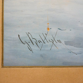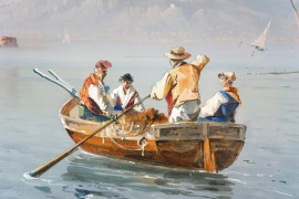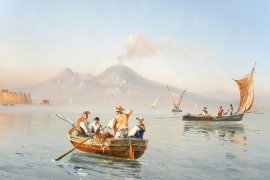 Golfo di Napoli con pescatori, gouache su carta, cm 27,5x46, firmato G. Battista, entro cornice