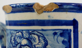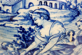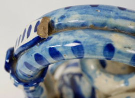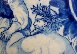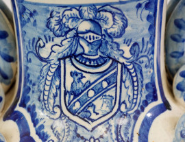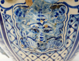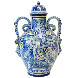 Grande vaso biansato in maiolica Savona, XVIII secolo, decorato in monocromia blu con figure classiche, coperchio a cupolino e manici serpentiformi, cm h 79, (difetti e restauri)