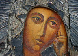 Icona raffigurante Madonna con Bambino, tempera su tavola rivestita in riza in metallo argentato, cm 31,5x27, XX secolo, (segni del tempo).