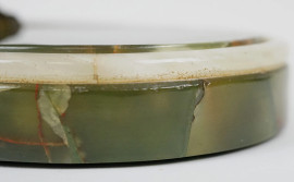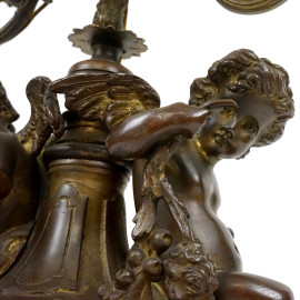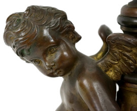 Lampada da tavolo a due luci, in metallo dorato e onice, fusto a balaustro affiancato da due putti reggifestoni, XX secolo, cm h 51,5, (difetti)