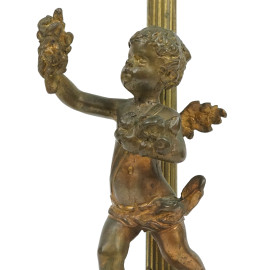 Lampada da tavolo in metallo dorato, fusto a colonnina scanalata con putto, base quadranfìgolare poggiante su piedini a cipolla, cm h 27,7, XX secolo, (difetti)