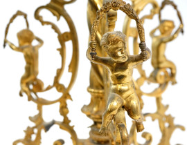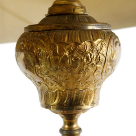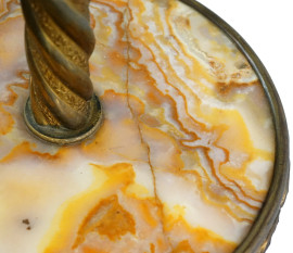 Lampada da terra in metallo dorato, fusto a torchon con pianetto circolare in onice, poggiante su base a tripode e piedini a ricciolo decorati da putti con ghirlande, fine XIX secolo, cm h 143, (difetti)