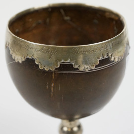 Lotto composto da un calice in cocco con finiture in argento, recante iscrizione sull'orlo, ed una zuccheriera in metallo argentato con prese a teste di leone, alt. max cm 14.5 (segni del tempo).