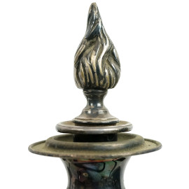 Lotto di due condelabri in metallo argentato a cinque e tre fiamme con bracci sinuosi, altezza max cm 41.5, (difetti, mancanze)
