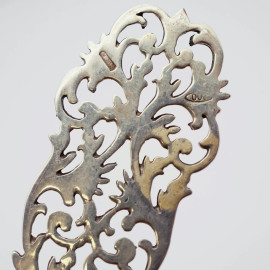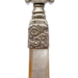 Lotto di due lenti in argento, metallo argentato e madreperla con decori a traforo, XX secolo, lunghezza max cm 18.5, (difetti)