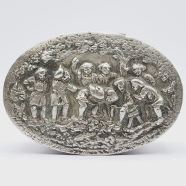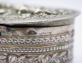 Lotto di due piccole scatoline in argento e metallo argentato con decori incisi e a rilievo, misure max cm 2,5x8x5,5, inizi XX secolo, peso argento gr. 38, (lievi difetti)