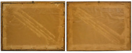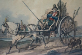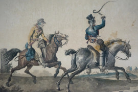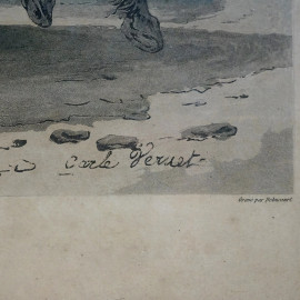 March de vin des environs de Rome e Route de poste, due stampe a colori, cm 47x62, Debucourt incisore, disegnatore Vernet, entro cornici, (difetti)