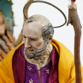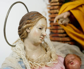 Natività, gruppo in terracotta dipinta, stoffa, legno ed altri materiali compositi, manifattura dell'Italia meridionale, firmata, cm h 64, completa di campana in vetro, (difetti)