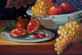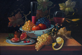 Natura morta - Uva, melagrana e vasellame, olio su rame, cm 14x19 circa, inizi XX secolo, entro cornice in legno intarsiato, (cadute di colore)
