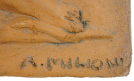 Nudo di donna, bassorilievo in terracotta, cm h 4x22x9, firmato A. Milioni.
